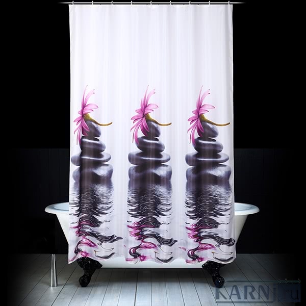 Занавеска из 100% полиэстера для ванны с 12 металлическими люверсами под кольца. Материал шторы обработан гидрофобной пропиткой, отталкивающей воду. Внизу по всей длине вшит шнур-утяжелитель.