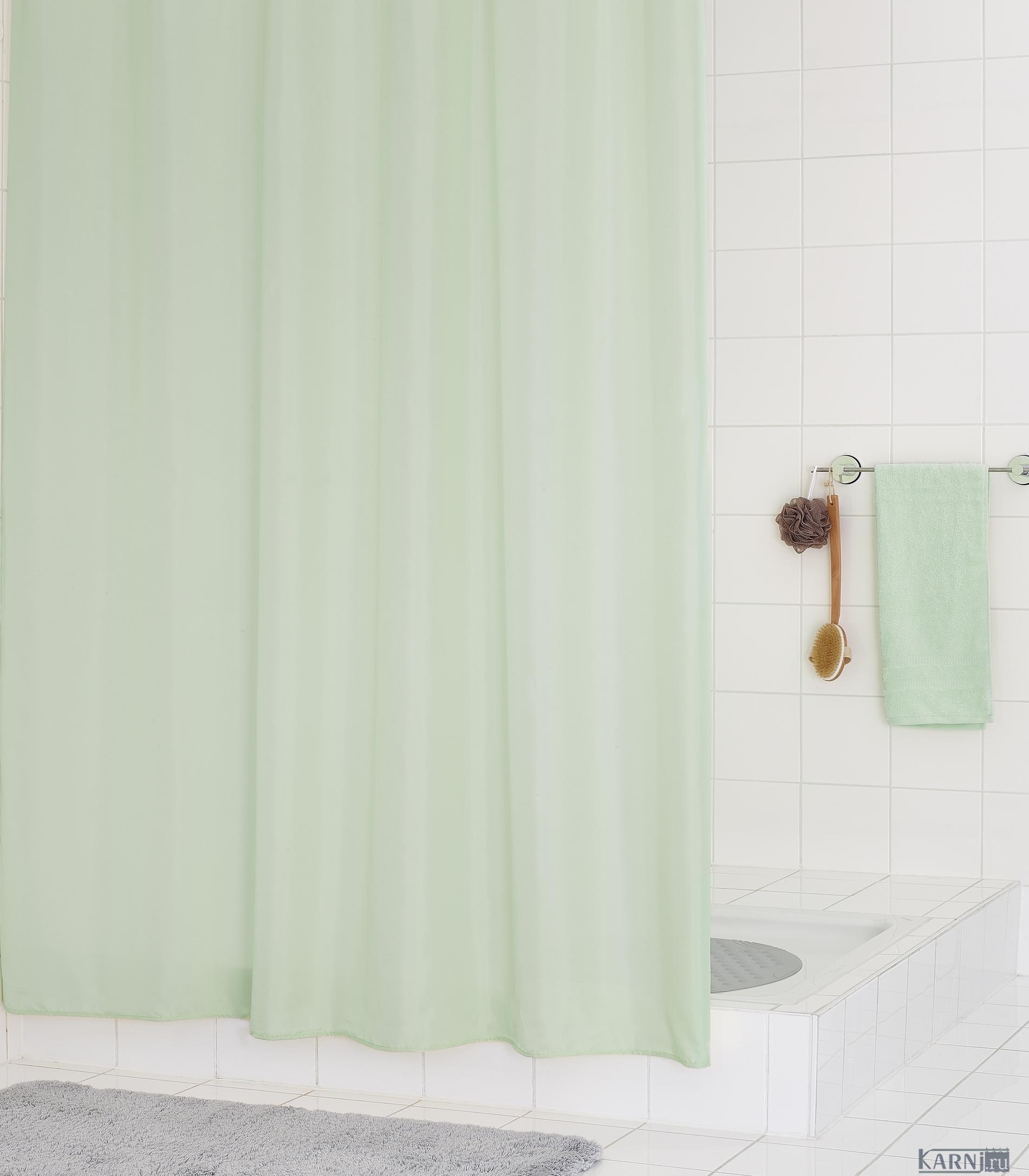 Занавеска из 100% полиэстера для ванны с 12 люверсами под кольца. Штора обработана специальной пропиткой, отталкивающей воду. Внизу по всей длине вшит шнур-утяжелитель.